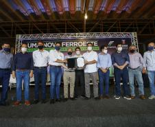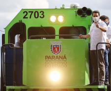 O governador Carlos Massa Ratinho Junior entregou nesta terça-feira (1º) o primeiro pacote de revitalização e modernização das locomotivas e vagões da Ferroeste. Foram atualizadas três das 14 locomotivas e dez dos 245 vagões da empresa pública no lote 1 desse pacote. O investimento global foi de R$ 1,4 milhão. A expectativa é modernizar a frota ferroviária para atender a Safra 2020/2021, estimada em 24,3 milhões de toneladas de grãos.